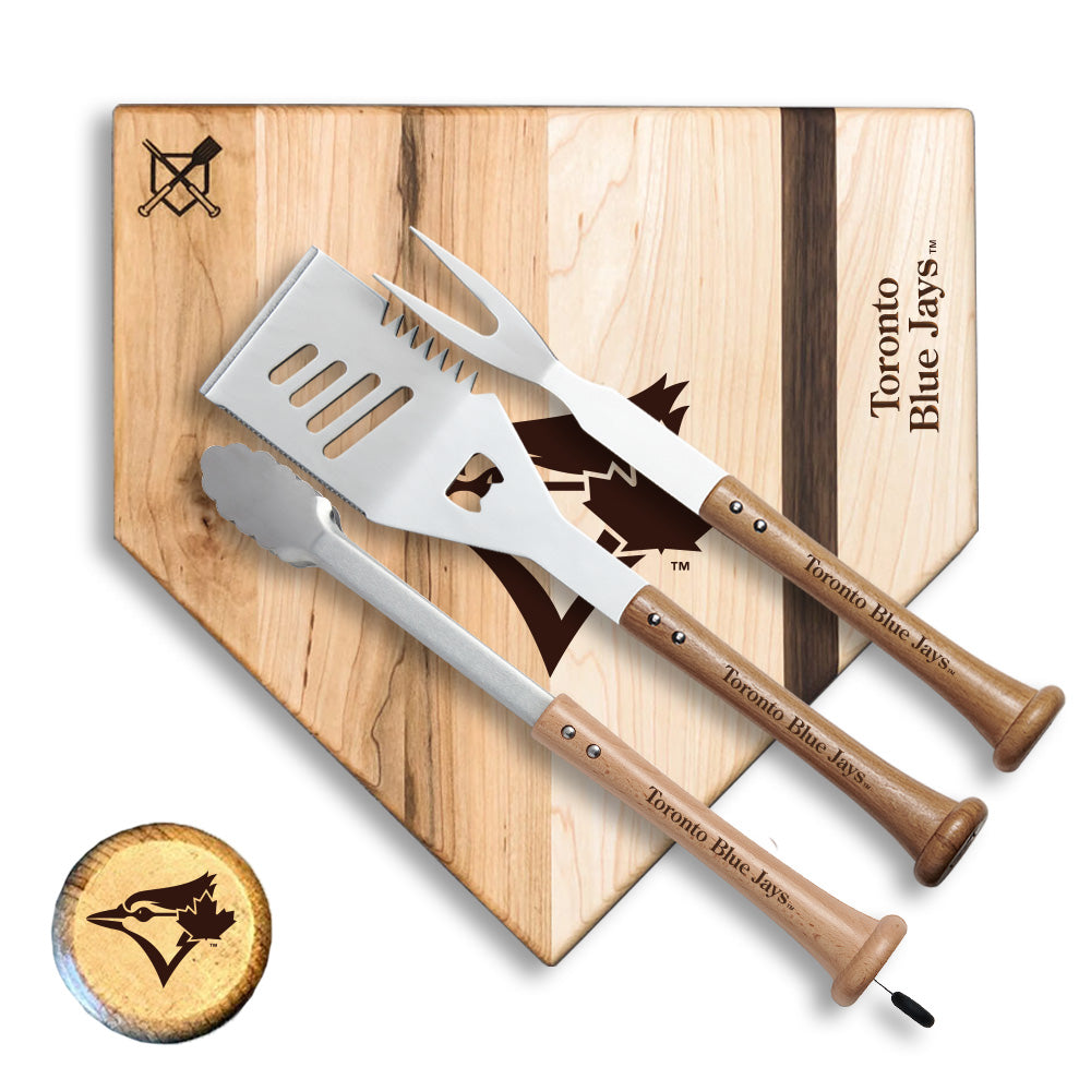 - Includes: "Slider" Spatula, "Forkball" Fork, "Splitfinger" Tongs, and "Home Plate" Cutting Board.
